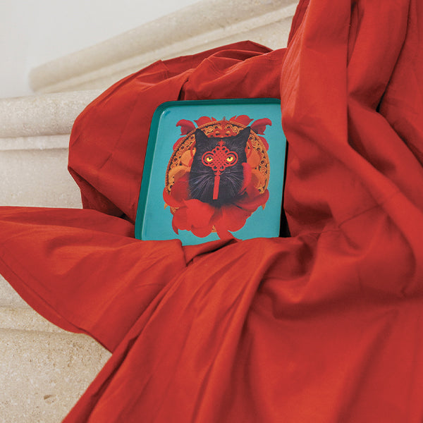 The Gangzai Chachino Square Trinket Tray is a darkly whimsical portrait that merges fortune and feline mystery. Against a vibrant jade backdrop, a sleek black cat emerges from a lush nest of opulent red petals and a detailed gold medallion. The cat's striking yellow eyes gaze out from behind a Chinese decorative knot—a potent symbol of luck, longevity, and endless fortune—rendered in brilliant vermillion. This unique piece transforms an everyday object into a conversation starter, perfect for bringing a dash of exotic, surreal luck and bold color to your home or display.