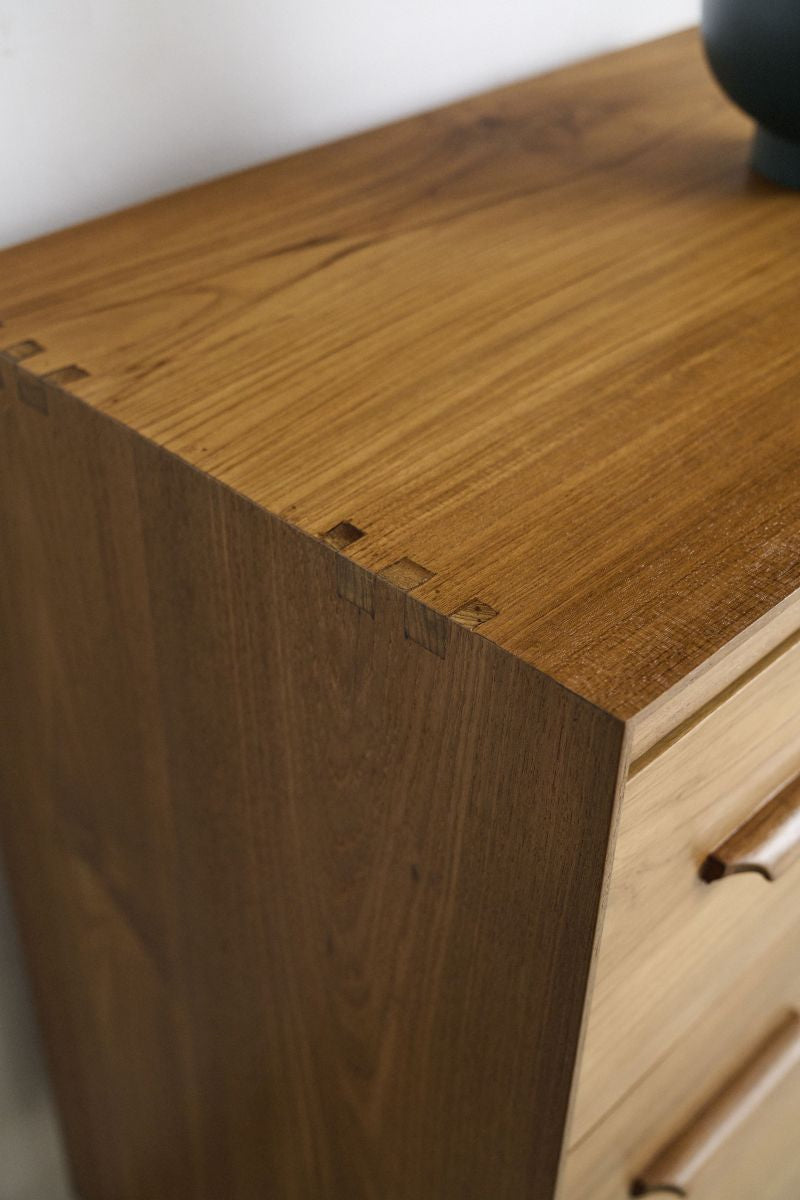 This 4 Drawer Bureau is a homage to the principles of vintage Scandinavian Midcentury design, echoing the clean lines and minimalist aesthetic of the modernist era. Built with an emphasis on structural integrity and traditional techniques, this piece is handcrafted from aged teak wood, seamlessly introducing a vintage, yet timeless, sophistication into any modern interior.