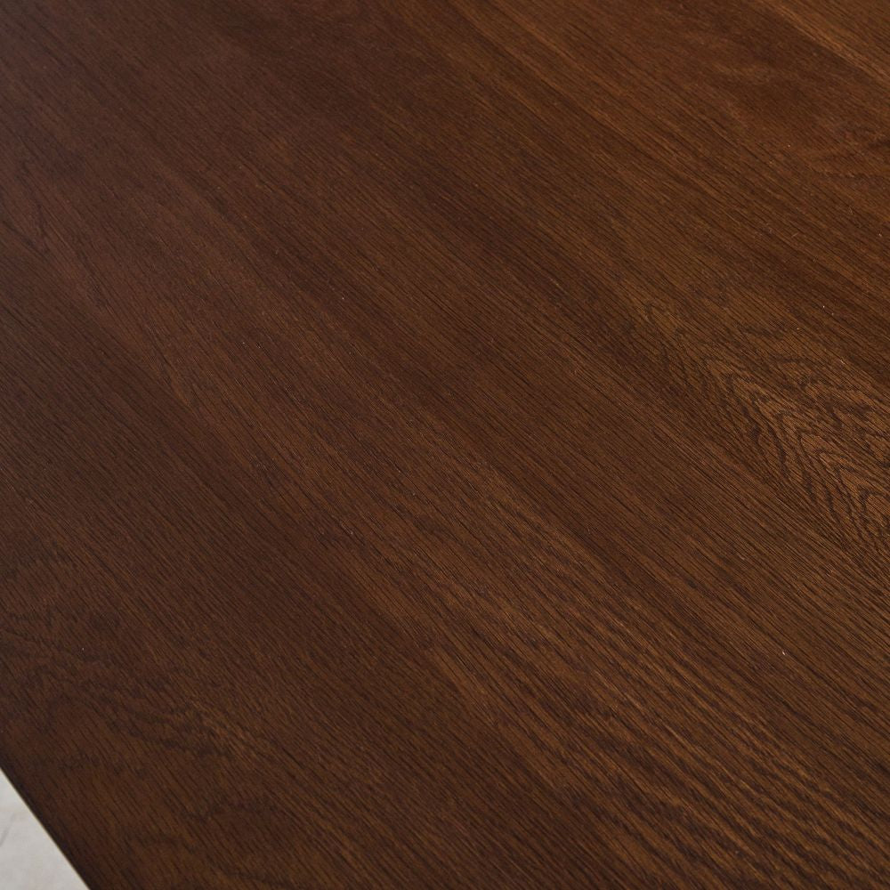 A tubular steel stretcher and steel braces beneath the deep-brown, seared oak-finished tabletop provide exceptional structural stability, preventing warping. Circular brass accents on each side add a touch of refined elegance, complementing the clean lines of the design.
