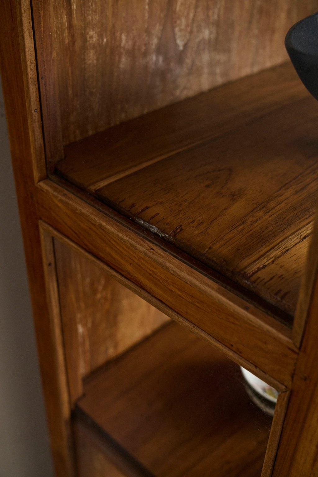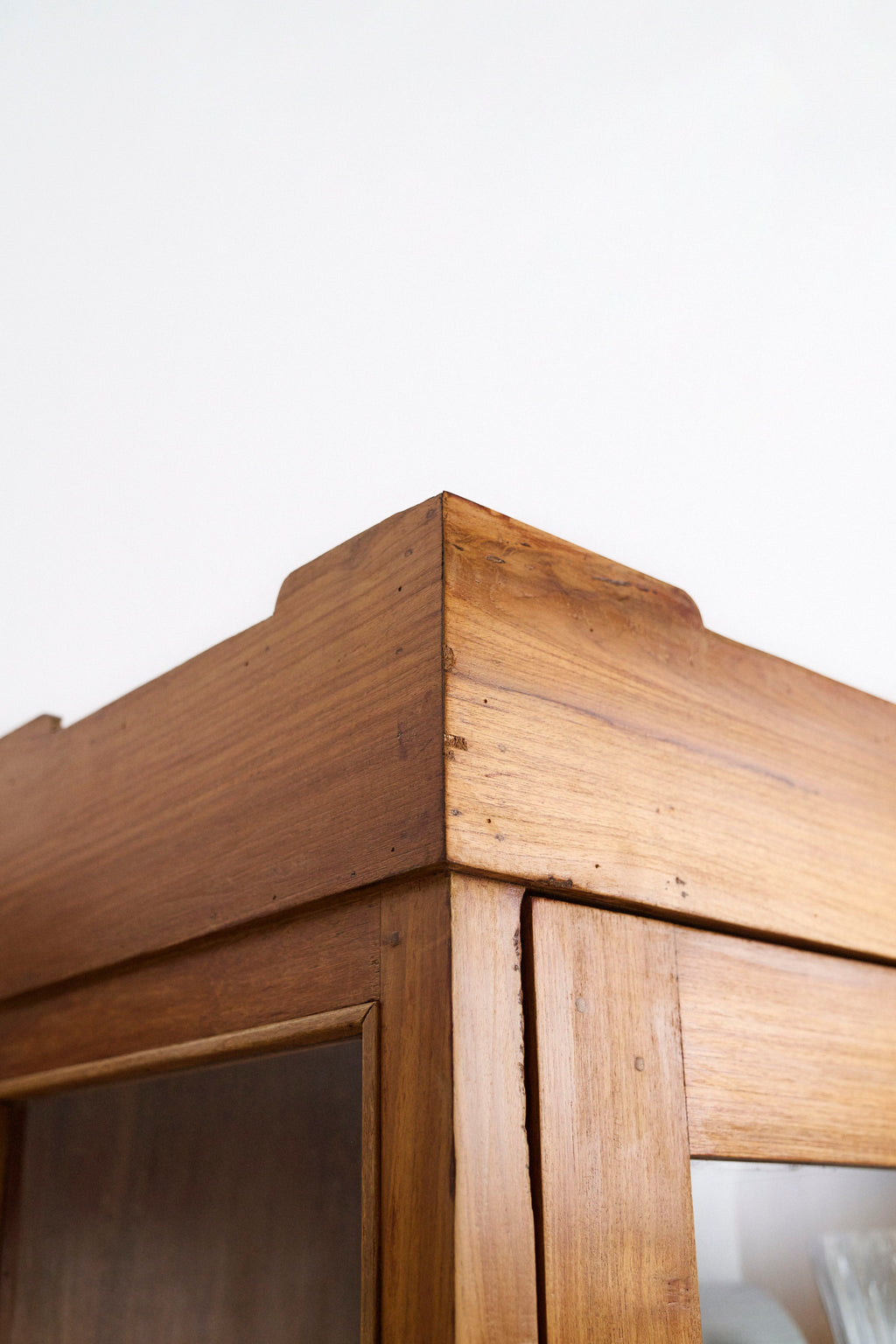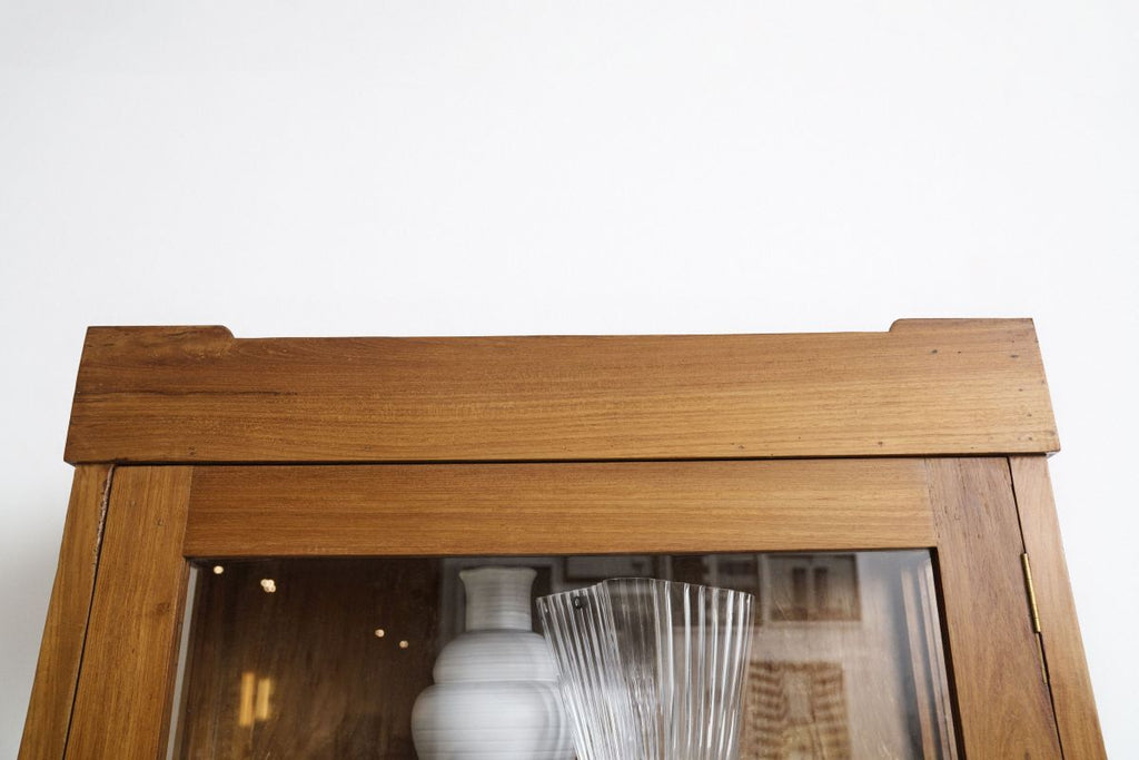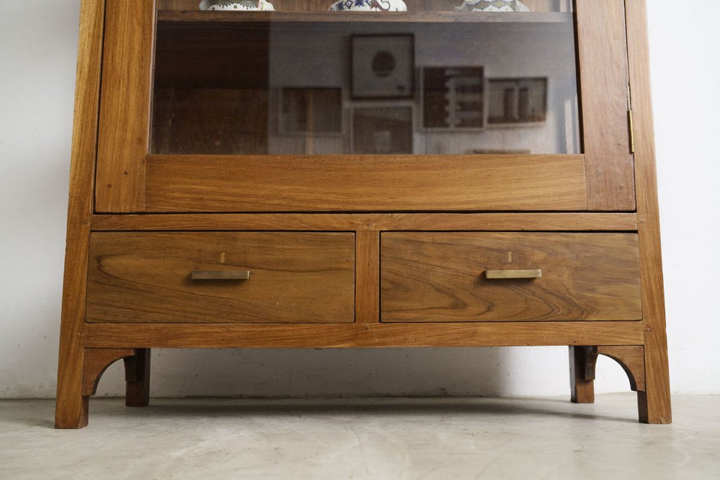 This vintage Art Deco Glass Display Cabinet is a stately piece, representing a striking fusion of style from the 1920s to 1930s. It blends the geometric discipline of the Art Deco movement with the robust, traditional forms of Dutch Colonial furniture. Handcrafted entirely from solid aged teak wood, this cabinet is defined by its architectural lines and the deep, enduring patina of its material.