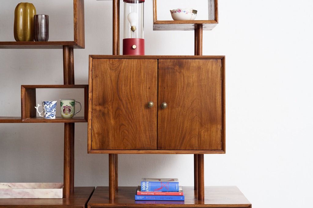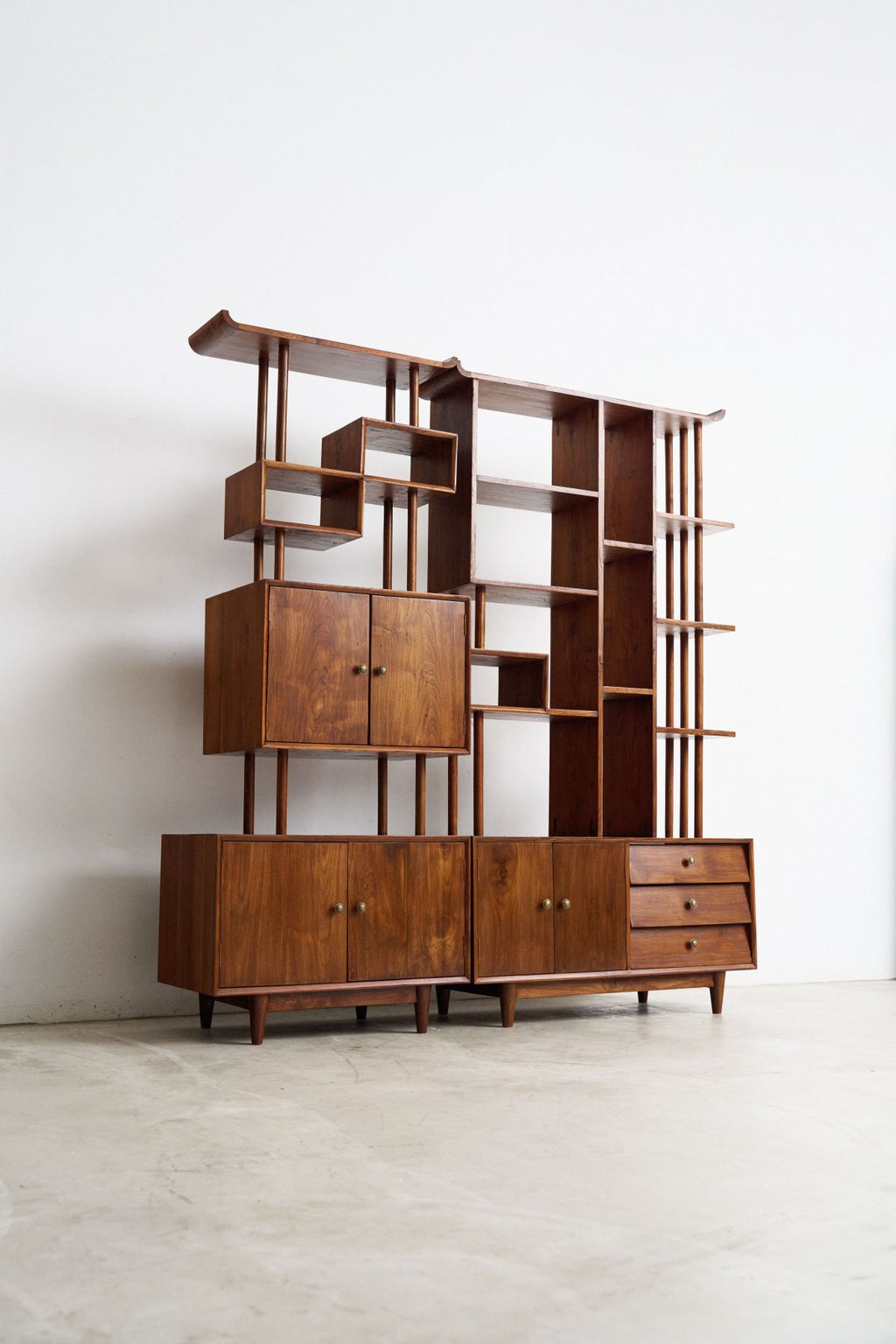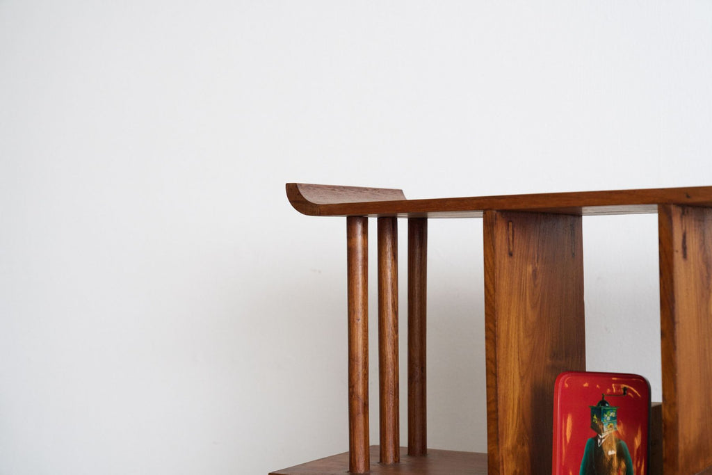 The architectural weight of this original 1950s shelf and room divider is immediately apparent in its freestanding, dual-sided silhouette. Inspired by Scandinavian trends like the Royal System by Poul Cadovius and the FM System by Kai Kristiansen, this vintage Asian interpretation brings modernist modularity into the centre of the room.