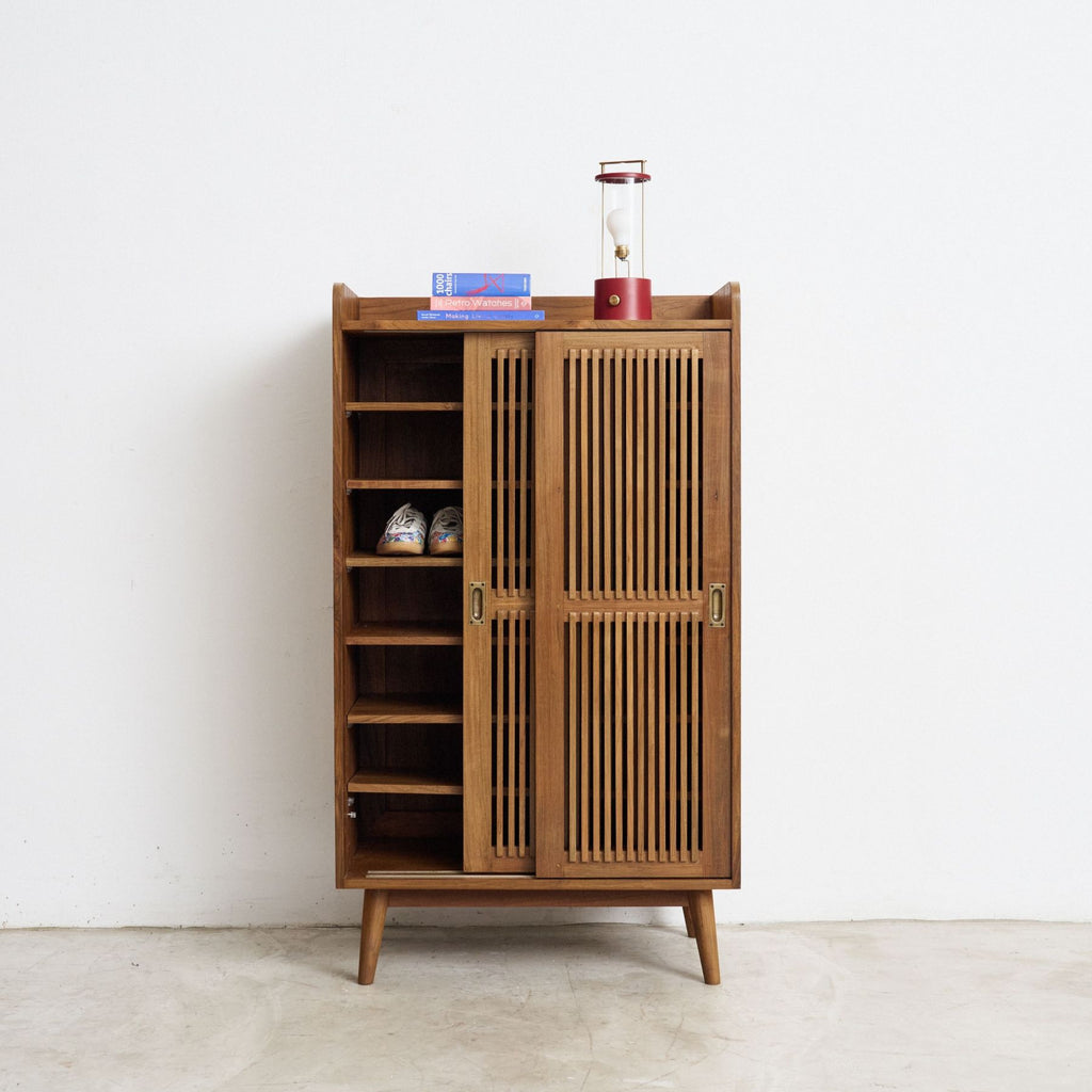 Drawing inspiration from the refined utility of the Midcentury era, the Shoe Cabinet with Slatted Doors offers a sophisticated solution for the modern entryway. The piece is anchored by a handcrafted frame of matured teak wood, showcasing a rich grain and structural honesty that grounds any doorway with a sense of quiet permanence.