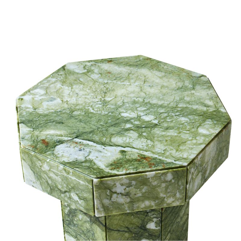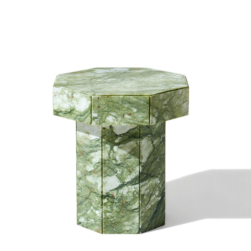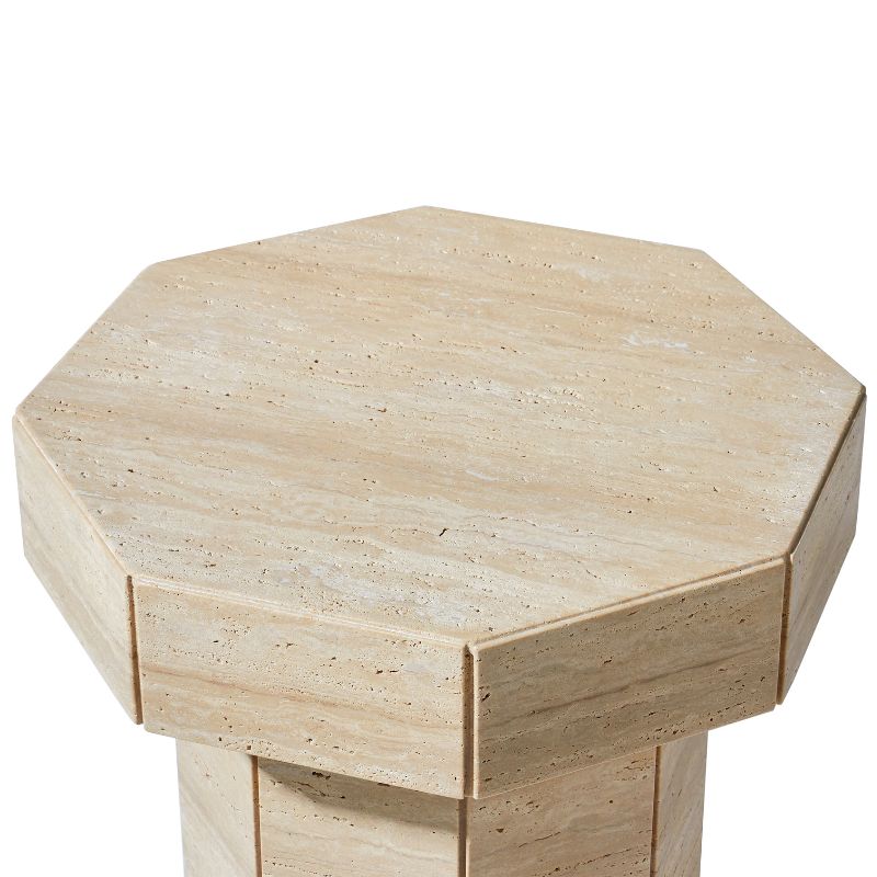 The bold, hexagonal silhouette provides a modern, architectural alternative to traditional forms, featuring faceted edges and a matching stone pedestal base that feels both ancient and futuristic. The Bel Air Side Table exemplifies the United Strangers commitment to exceptional quality and unique character, transforming a functional object into a poetic statement of materiality and form.