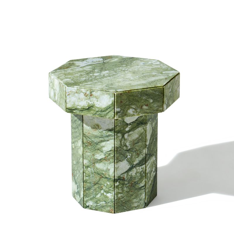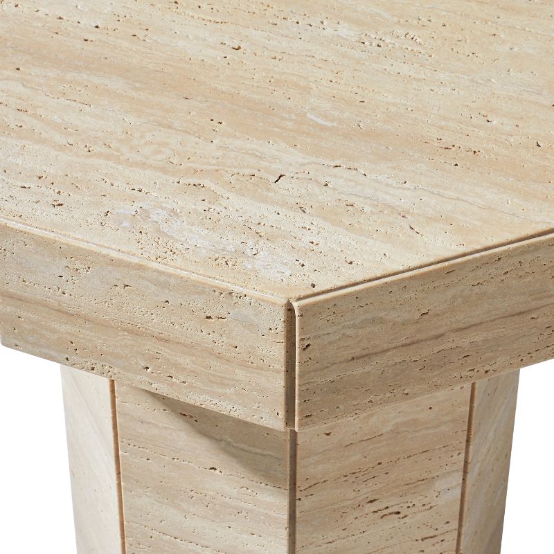 The table's defining feature is its extraordinary material composition, crafted entirely from solid slabs of stone. It is available in a sophisticated Matte Ivory Travertine, presenting a tapestry of creamy, tonal layers and characteristic porous textures. For a bolder aesthetic, the side table is also available in Matte Verdence Green marble, which features a tapestry of deep forest greens, soft sage veining, and occasional earthy inclusions.