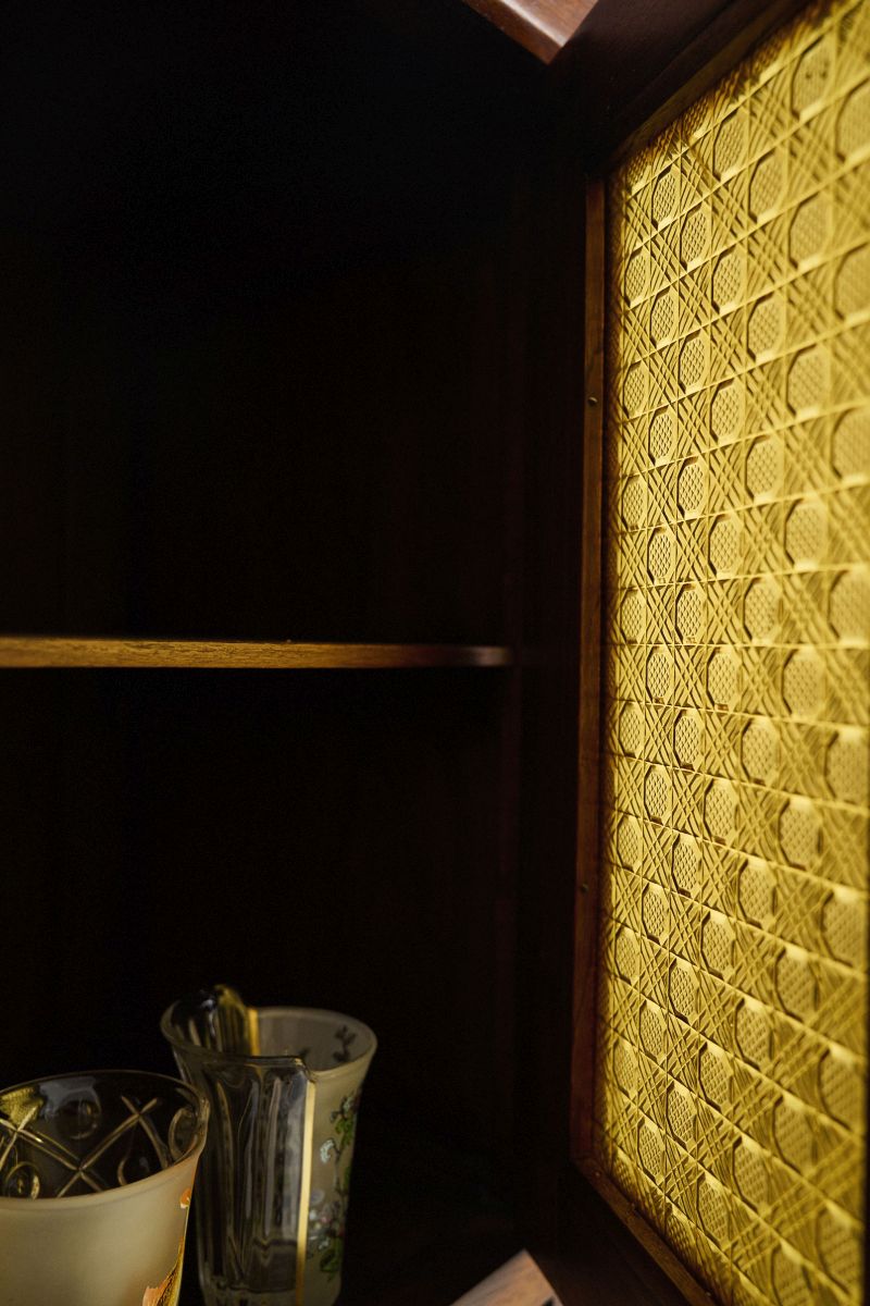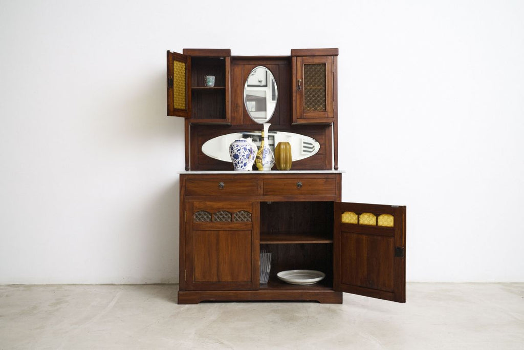 The unit’s detailing speaks to its luxury: the countertop has been restored with a beautiful marble surface, offering a durable and opulent contrast to the rich patina of the teak. The buffet features two original bevelled oval mirrors that add light and classic Art Deco curve contrast.