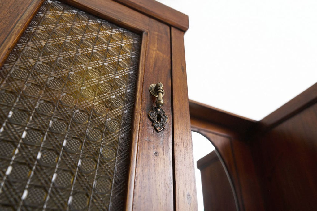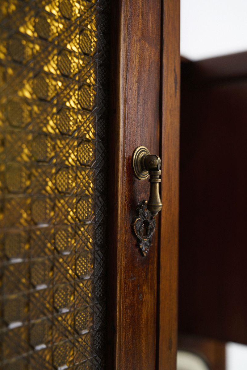 The cabinet doors and drawers showcase a masterful blend of geometry and elegance: The upper sections feature original yellow-hued patterned glass in two rectangular panes, while the lower doors feature the same glass rendered in a distinctive scalloped or overlapping arc frieze. The original hardware is a sophisticated fusion, featuring original rosette backplates fitted with classic drop-ring pulls, as well as original floral keyhole plates.