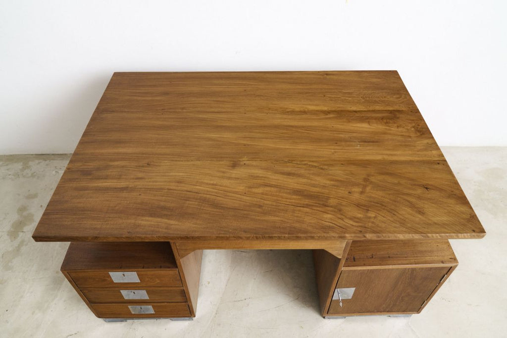 This original Partners' Desk is a monumental piece of Art Deco furniture, dating from the 1920s–1930s. Handcrafted from beautiful solid aged teak wood, its proportions exhibit a sense of geometric rigour and architectural scale, making a perfect fit for the era's grand office environments.