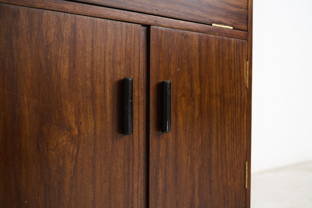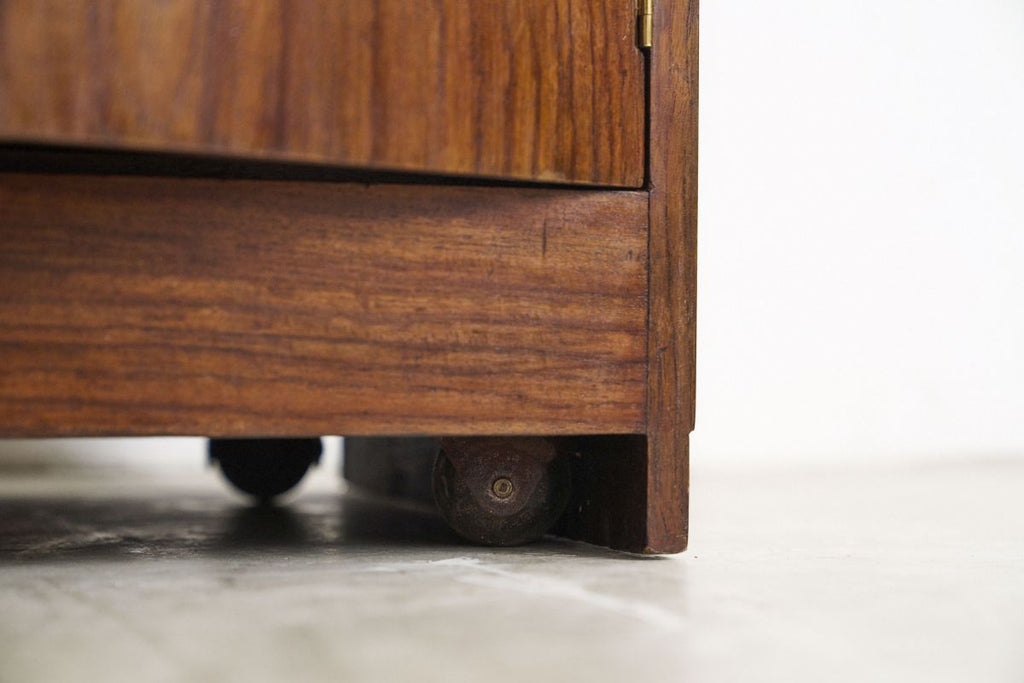 The piece is handcrafted from beautifully aged teak wood, showcasing a rich, stunning wood grain and patina. It is filled with authentic vintage detail, including the original lock and key for the upper compartment, and is set on original castor wheels, allowing for easy repositioning.