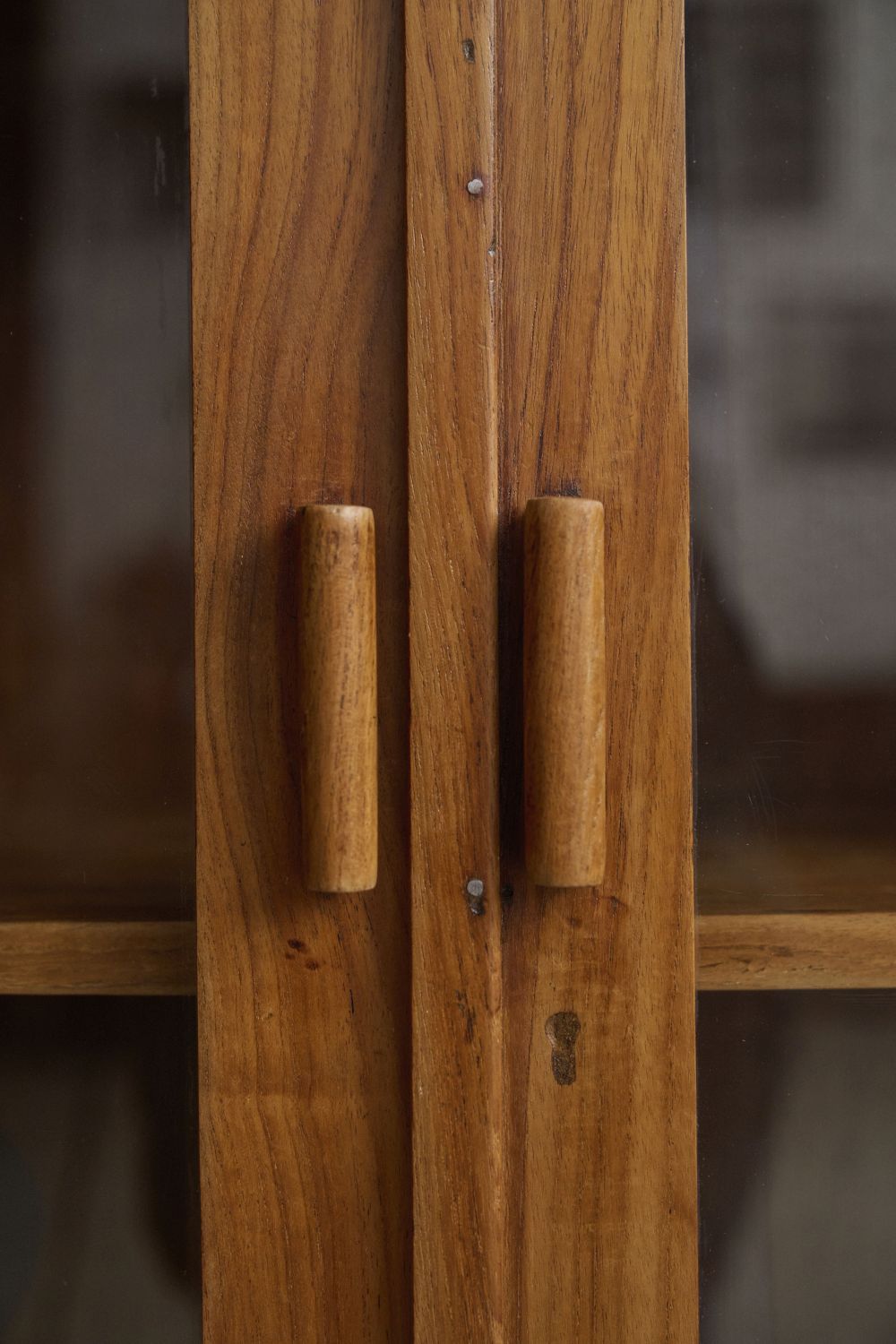 The cabinet's geometric simplicity is grounded by a distinctive stepped platform base, a subtle yet sophisticated detail of its design. Adding to its unique charm are the rounded carved teak handles, which provide a tactile contrast to the cabinet's clean lines.